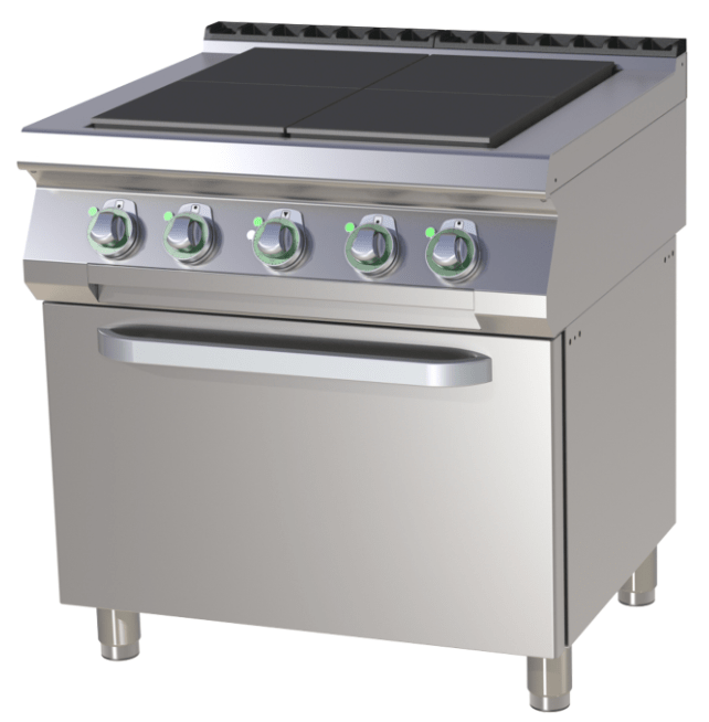 Elektriskā plīts ar cepeškrāsni, korpuss izgatavots no NT, četras sildvirsmas ar jaudu 4×2.5kW, 6 pakāpju jaudas regulators katrai virsmai.